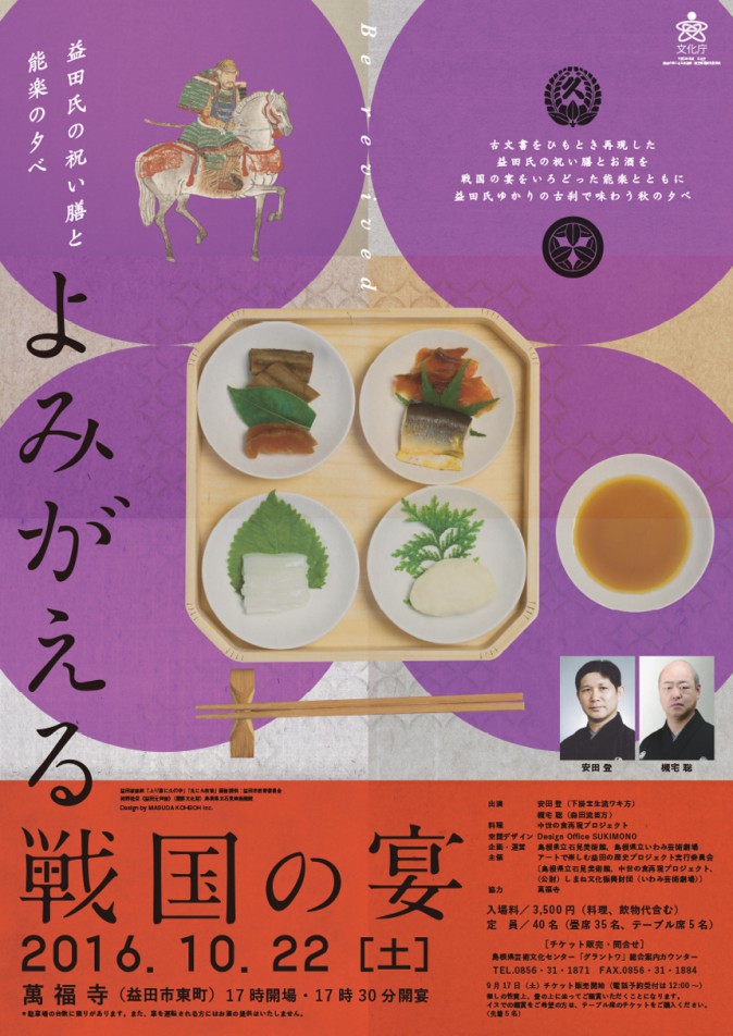 島根県益田市の萬福寺で開催される「益田氏の祝膳と能楽の夕べ よみがえる戦国の宴」の広告物を作成させていただきました。