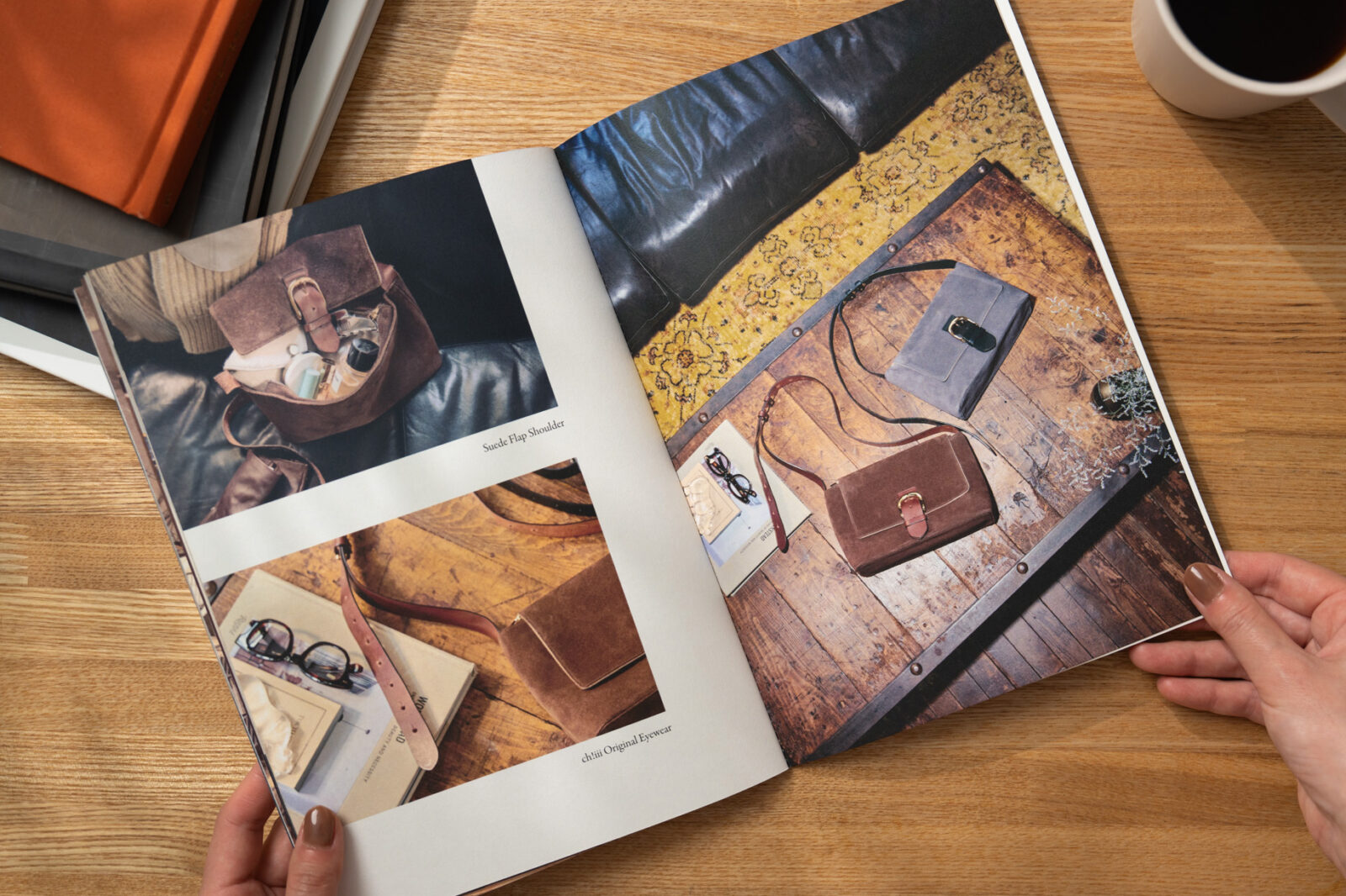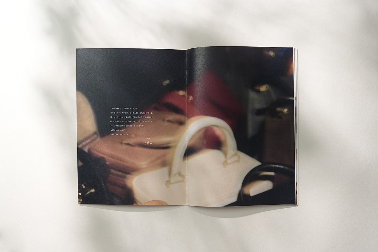 Ch!iiiブランドは20~50代と幅広い層に愛されており、特に大人の女性がコアターゲットです。そのため、落ち着きも感じさせながら、日常を楽しむワクワクした遊び心も持ち合わせている、そんなカタログにしたいと考えました。ページ毎にレイアウトに変化をつけて、一日の一瞬一瞬をバックと一緒に楽しんでいる様子を表しています。表紙にもちょっとした工夫をしました。