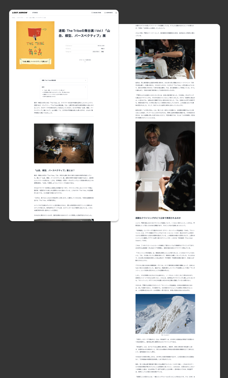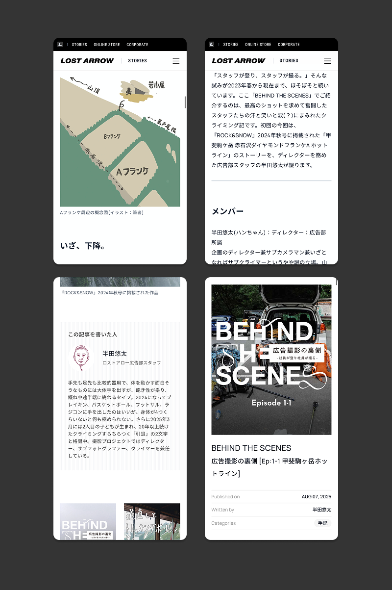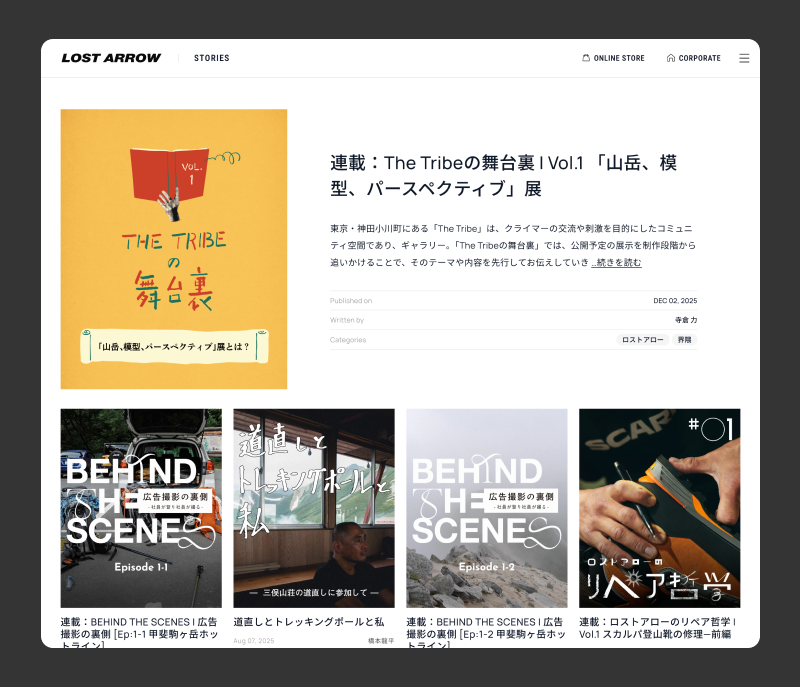 ロストアローは、1984年設立の、登山、クライミング、バックカントリーなどのアウトドアスポーツ用品の輸入・販売を行う会社です。このほど、同社のオウンドメディアの開設にあたり、企画制作・デザインを担当させていただきました。