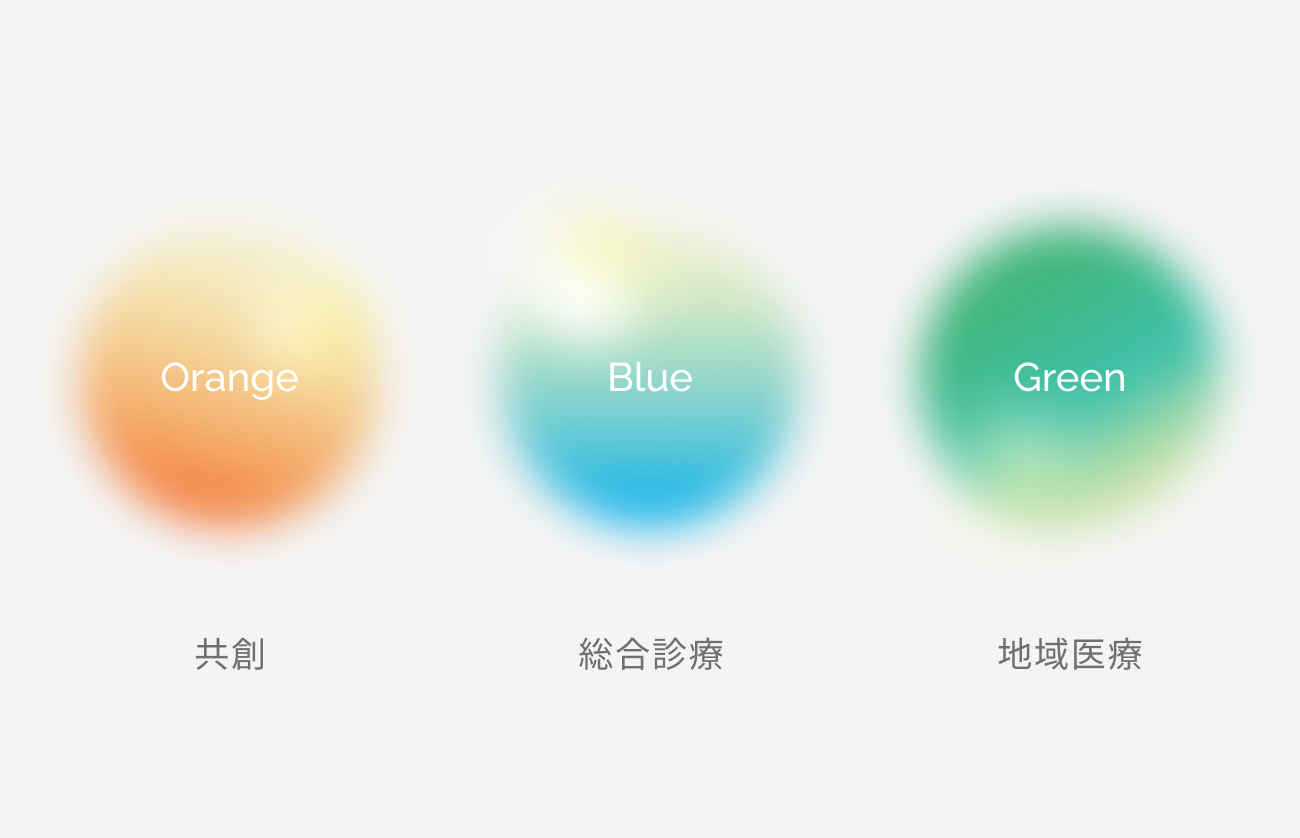 オレンジ=共創、ブルー=総合診療、グリーン=地域医療、で構成する。